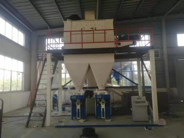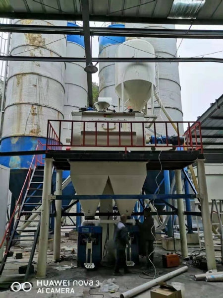 該型號(hào)設(shè)備由原料倉(cāng)、輸送螺旋、配料秤、斗式提升機(jī)、雙軸無(wú)重力混合機(jī)、主機(jī)平臺(tái)、成品倉(cāng)、自動(dòng)包裝機(jī)、除塵器等組成。主要用于生產(chǎn)石膏砂漿、抹灰石膏砂漿等產(chǎn)品。